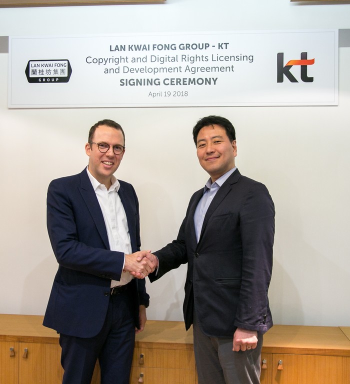 홍콩 란콰이펑 그룹 본사에서 란콰이펑 그룹 최고경영자 조나단 제만(왼쪽)과 KT 콘텐츠플랫폼사업담당 전대진 상무(우측)가 계약 체결 후 기념촬영을 하고 있다.