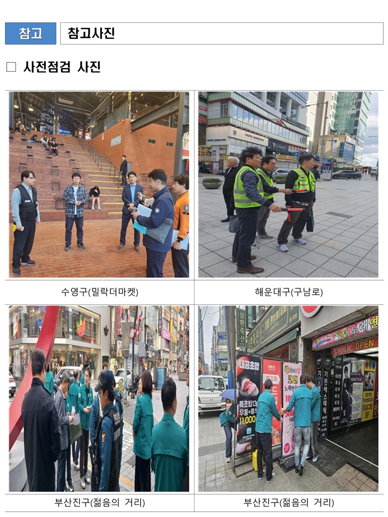 시는 3개 구, 경찰, 소방 등 유관기관과 합동으로 10월 23일 해운대구 구남로 일원, 10월 24일 부산진구 서면 젊음의 거리, 수영구 밀락더마켓 및 광안리해변 인근 인파 밀집이 예상되는 유흥업소 등을 방문하여 사전점검을 진행했다.