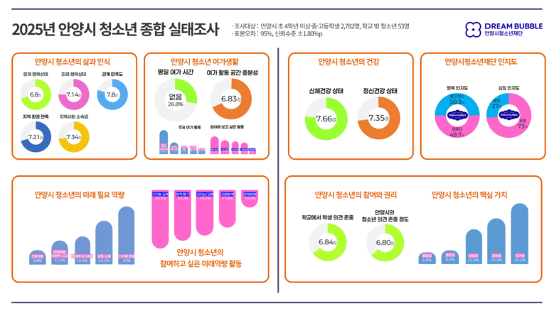 이번 조사는 안양시 청소년의 삶·여가·참여·건강·안전·재단 인지도 전반을 종합적으로 파악하고 향후 청소년 정책 수립에 반영하기 위해 지난 6월 9일부터 10월 6일까지 실시됐다. (표본오차 95%, 신뢰수준 ±1.80%p)