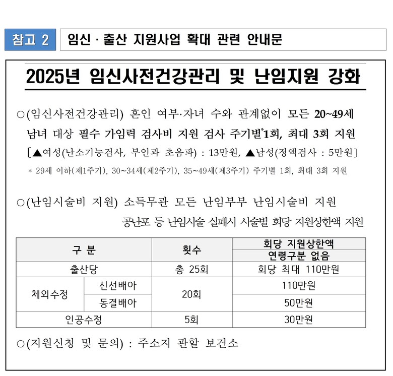 난임부부지원 확대를 위해 난임 시술비를 출산당 최대 25회 지원하고, 공난포 등 난임 시술 실패 시, 시술비를 지원해 난임에 대한 불안감을 사전에 해소하고 아이를 낳고 싶어 하는 부부에 대한 전폭적인 지원을 이어 나갈 예정이다.