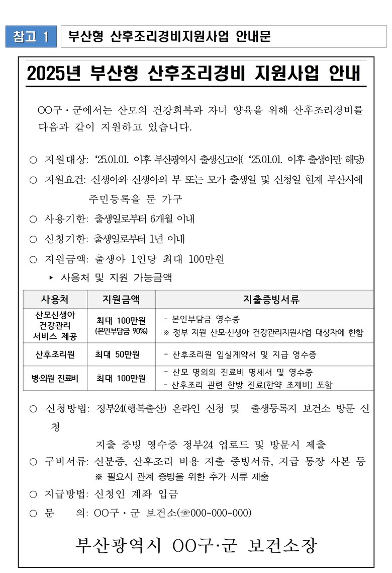 부산시에 거주하는 출산 가구의 경제적 부담을 덜어주고자 소득과 무관하게 산후조리 관련 비용을 지원한다.