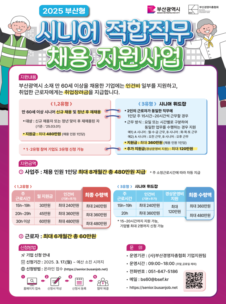 이번 사업은 시가 선정한 '부산형 장년(시니어) 적합 직무' 분야에 60세 이상 구직자를 채용할 시, 채용 인원 1인당 매월 최대 60만 원씩 8개월간 총 480만 원의 인건비 일부를 기업에 지원한다.