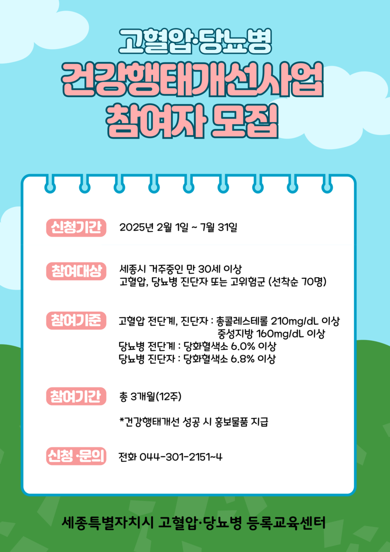 건강행태개선사업과 관련된 기타 자세한 사항은 세종시 고혈압·당뇨병 등록교육센터(☎044-301-2151~4)로 문의하면 된다.
