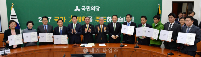 4일 오전 서울 여의도 국회 국민의당 대표실에서 열린 공명선거 선포식에 참석한 후보들이 서약서를 들고 기념촬영을 하고 있다. 왼쪽부터 양미강, 신용현 여성위원장 후보, 박지원, 황주홍 당 대표 및 최고위원 후보, 주승용 원내대표, 장병완 중앙당 선거관리위원장, 김동철 비상대책위원장, 박주선 전당대회준비위원장, 손금주, 김영환 당 대표및 최고위원 후보, 김병운, 김지환, 김정환 청년위원장 후보. 2017.01.04.