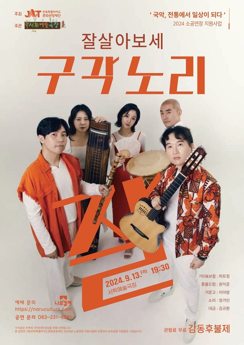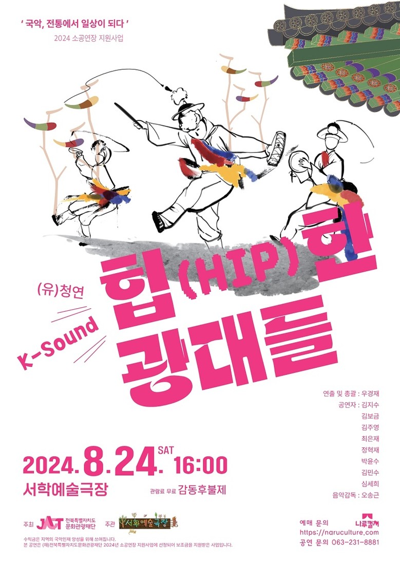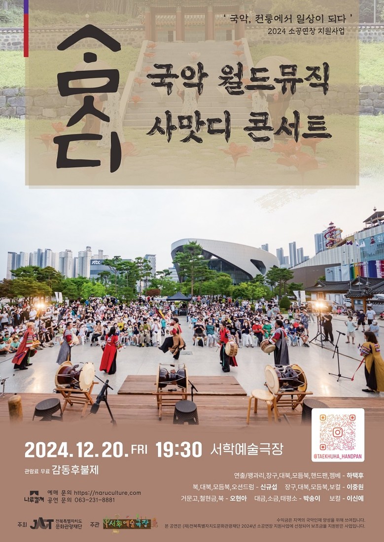 [전북특별자치도문화관광재단=세계타임즈 이상호 기자] 전북특별자치도문화관광재단(대표이사 이경윤, 이하 재단)이 운영하는 ‘2024 소공연장 지원사업’의 성과로 전북 고유의 문화예술 자원을 활용한 콘텐츠가 7월 5일부터 도민에게 찾아온다. 바로 서학예술극장(대표 이여송)이 준비한 전통예술 기획 공연 시리즈 ‘국악, 전통에서 일상이 되다’가 그 주인공이다.