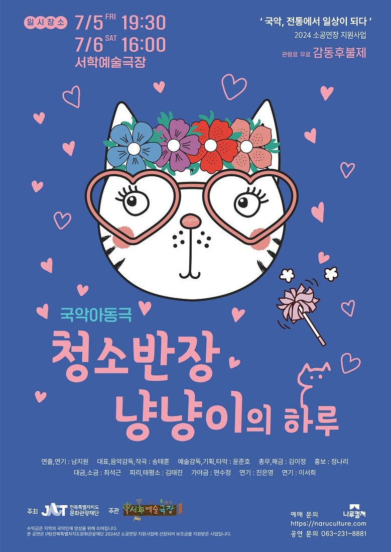 7월 5일~6일에는 국악 실내악단 ‘초화’가 창작한 국악 아동극 ‘청소반장 냥냥이의 하루’가 무대에 오른다. 한옥마을에 살고 있는 고양이 냥냥이가 쓰레기 더미로부터 한옥마을을 지키기 위해 청소반장에 도전하며 일어나는 일들을 국악으로 재미있게 표현한다.