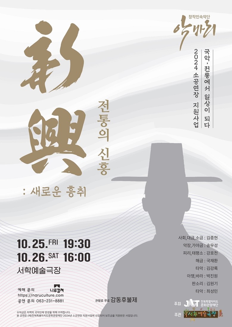 한편 오는 7월 5일 개막하는 ‘국악, 전통에서 일상이 되다.’는 전주시 완산구 서서학동에 위치한 ‘서학예술극장’에서 만나볼 수 있다. 모든 공연은 도민의 문화예술 향유 기회 확대를 위해 무료 예매 및 *감동 후불제로 진행되며, 본 공연을 통해 발생한 수익은 차세대 지역 국악인 양성을 위해 기부된다.