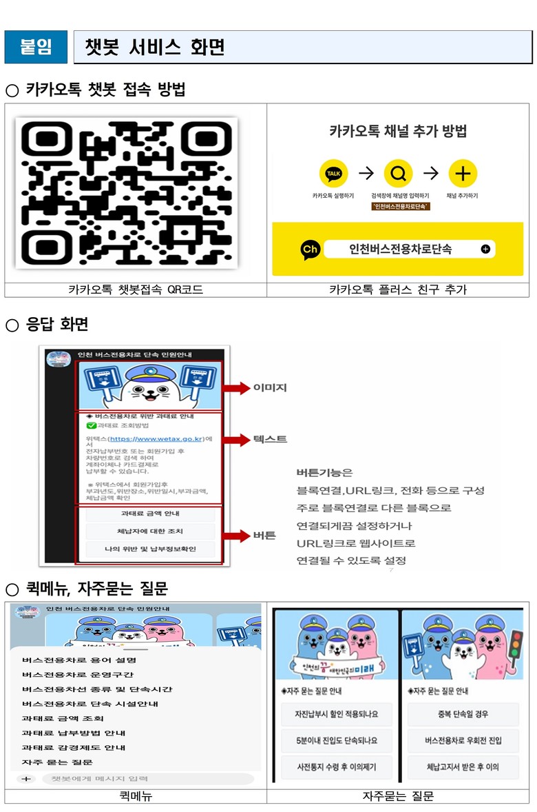 챗봇 서비스 이용은 매우 간단하다. 카카오톡 친구 목록 화면의 검색창에서 '인천버스전용차로 단속'을 검색하여 플러스친구로 등록하거나, 전용 정보무늬(QR코드)로 접속하면 즉시 서비스를 이용할 수 있다. 채팅창에 키워드나 간단한 문장을 입력하면 실시간으로 답변을 받을 수 있으며, 시나리오형 타입으로 구성되어 문자와 이미지, 이모티콘, 민원사이트 링크 등 시각적인 자료를 활용하여 시민들이 더욱 쉽게 이해할 수 있도록 했다. 또한, 친숙한 느낌의 인천시 캐릭터인 '버미', '꼬미', '애이니'가 챗봇 마스코트가 되어 친절하게 안내를 도와준다.