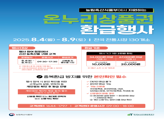 행사 기간 동안 국내산 신선 농축산물을 구매한 소비자에게 구매 금액에 따라 최대 30%까지 온누리상품권으로 환급해 준다. 1인당 환급 한도는 2만 원이며 구매 금액에 따라 환급 금액이 달라진다.