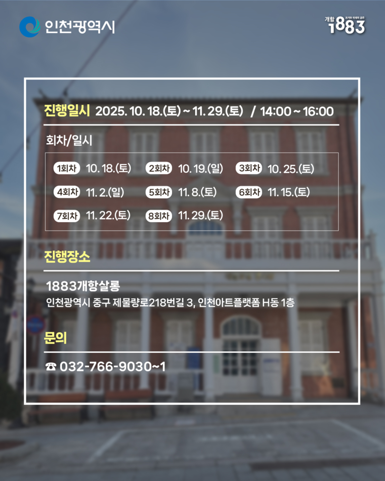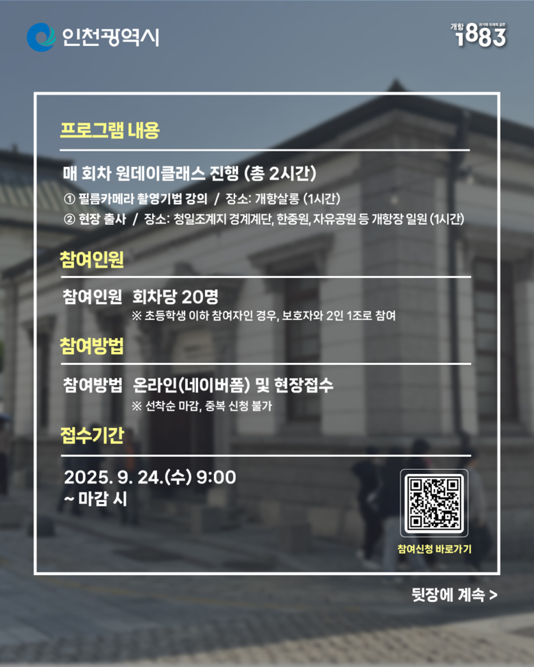 참가 신청은 9월 24일부터 온라인 선착순으로 접수하며, 자세한 사항은 인천시 및 1883개항살롱의 공식 사회관계망서비스(인스타그램 및 페이스북 등)에서 확인할 수 있다.