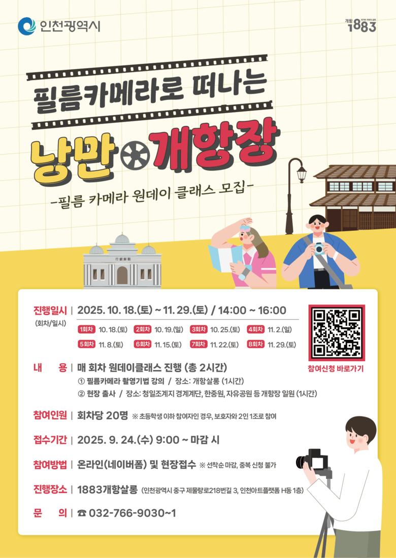 원데이클래스는 10월부터 11월까지 주말 총 8회 차에 걸쳐 진행되며, 회차별 20명씩 총 160명이 참여할 수 있다. 참가자들은 촬영 기법에 대한 강의를 들은 후 개항장의 주요 관광지를 찾아 출사에 나서게 된다. 이후 우수한 작품들은 12월 인천아트플랫폼에서 열리는 사진전에 공개될 예정이다.