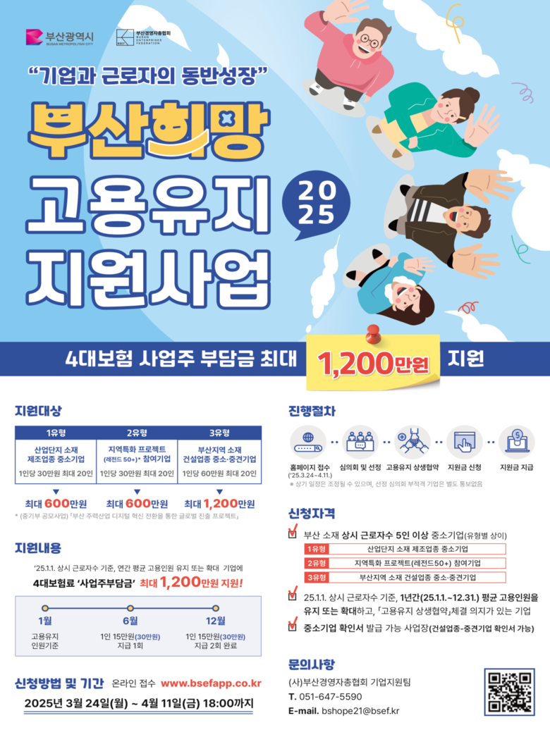 시는 부산 중소·중견기업이 '고용유지 상생협약'을 이행하고 올해 1월 1일을 기준으로 향후 1년간 고용을 유지 또는 확대할 시, 4대 보험료 사업주 부담금을 지원한다.