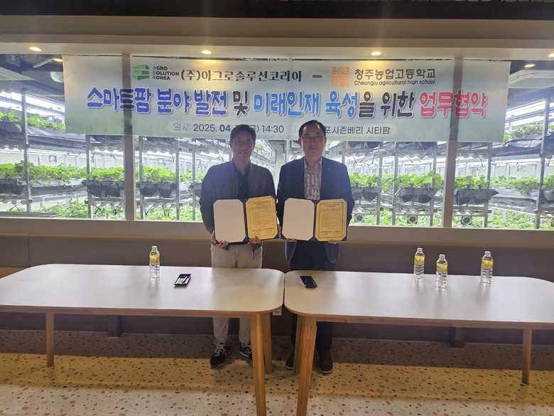 [충북 세계타임즈=이현진 기자] 청주농업고등학교(교장 고종현)는 11일(금), 주식회사 아그로솔루션코리아(대표 이상훈)과 스마트팜분야의 발전 및 인재 육성을 위한 업무협약을 체결했다.