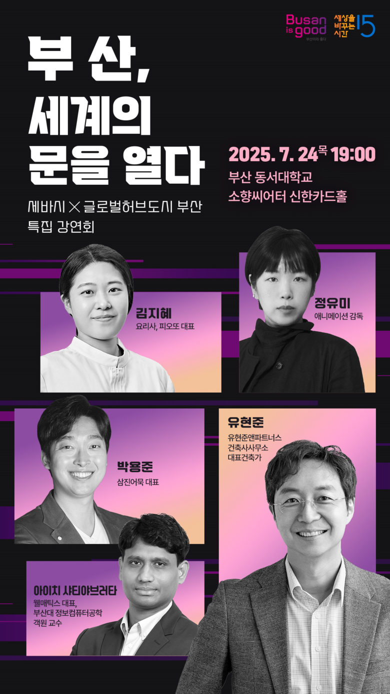 첫 번째 연사로는 대중적으로도 친숙한 건축가 유현준 교수가 나선다. 유 교수는 도시공간의 창의적 재해석과 ‘사람이 머물고 싶은 도시’의 조건을 부산만의 시각으로 풀어내며, 세계적(글로벌) 도시로 나아가기 위한 부산의 공간적 잠재력을 제시할 예정이다.