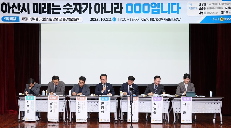도의회는 22일 아산시 배방행정복지센터 대강당에서 ‘아산시 미래는 숫자가 아니라 ○○○입니다’를 주제로 의정토론회를 개최했다. 토론회 좌장인 안장헌 의원(아산5·더불어민주당)은 “도시의 발전은 숫자와 순위로 평가되는 것이 아니라 시민의 일상 속 행복으로 증명돼야 한다”며 “오늘 이 토론회가 시민의 생각이 정책으로 이어지는 계기가 되길 바란다”고 말했다.