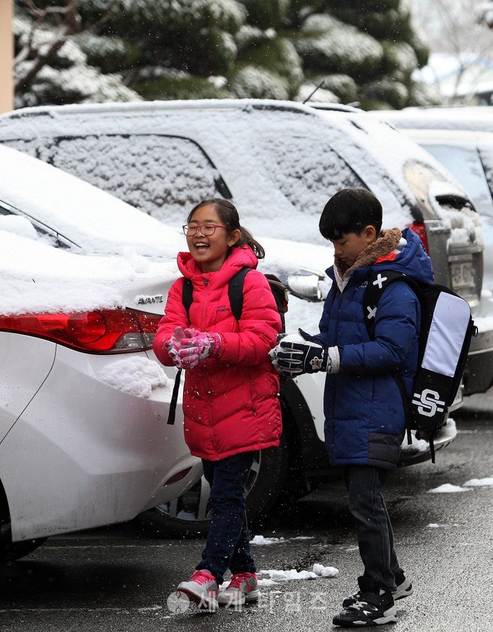 강한 바람과 함께 눈이 내리며 꽃샘추위가 기승을 부리고 있는 7일 오전 광주 광산구 한 아파트 주차장에서 등굣길에 오른 초등학생들이 눈을 만지며 즐거워 하고 있다. 2017.03.07.