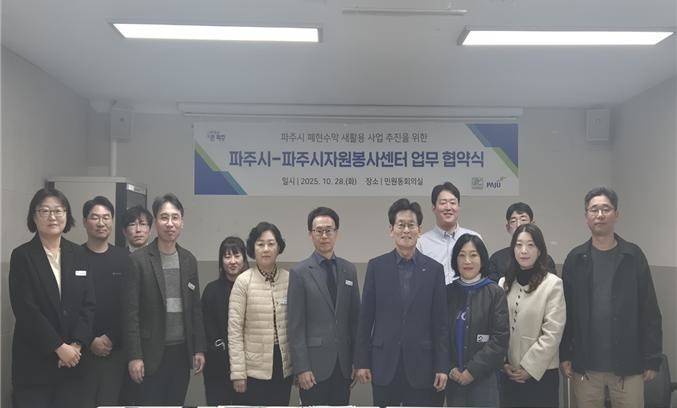 이날 협약식에는 박기정 건축주택국장, 장혜현 건축디자인과장을 비롯한 시 관계자와 나상배 파주시자원봉사센터장 등 20여 명이 참석해 폐현수막 새활용 체계 구축 및 지속 가능한 자원순환 활성화를 위한 협력 의지를 다졌다.