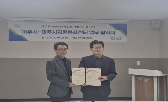 [파주시 세계타임즈=송민수 기자] 파주시는 지난 28일 민원동 회의실에서 파주시 폐현수막 새활용(업사이클링) 사업 추진을 위해 파주시자원봉사센터와 업무 협약을 체결했다고 밝혔다.