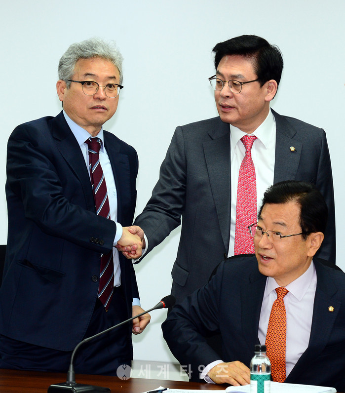 정우택(오른쪽) 원내대표가 7일 오전 서울 여의도 국회에서 진행된 자유한국당 원내대책회의에 앞서 이철우(왼쪽) 의원과 인사를 나누고 있다. 2017.03.07.