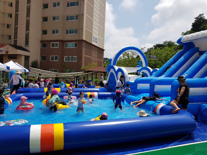 부영그룹(회장 이중근)은 5~6일 14개 부영아파트 단지에 슬라이드, 에어풀장, 에어아치 등 물놀이 시설을 설치해 지역사회 주민들과 화합을 도모했다. 아파트 주민들은 시원한 물놀이와 함께 더위를 식히며 돗자리에서 도시락, 간식 등을 먹기도 했다. ‘부영 사랑으로 어린이집’ 원아들과 학부모들은 물장구치며 첨벙거리는 모습을 셀카 촬영하기도 했다.