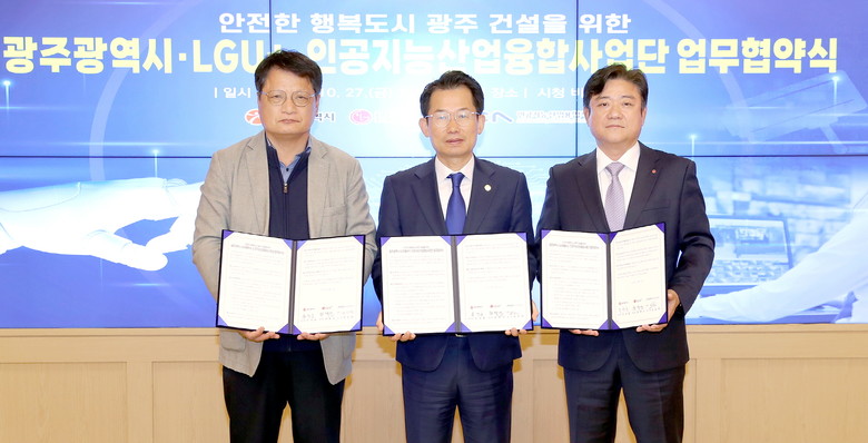 광주광역시(시장 강기정)는 27일 시청 비즈니스룸에서 인공지능을 활용한 CCTV관제센터 관제기술 고도화를 위한 회선사업자인 엘지유플러스(LGU+), 인공지능데이터센터를 운영하는 인공지능산업융합사업단과 ‘안전도시 광주건설 업무협약’을 체결했다.