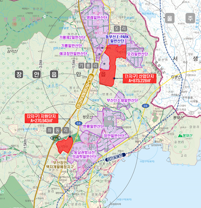 이에 따라 시는 이차전지, 전력반도체 등 산업용지 확보를 위한 신규 산업단지 '동부산이파크(2단계) 일반산업단지'를 기장군 장안읍 기룡리, 오리, 좌동리 일원에 약 114만제곱미터(㎡) 규모로 조성한다.
