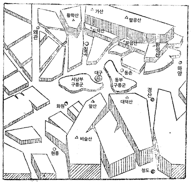 바로 다무라 가즈히사가 1933년 집필한 「조선 향토지리의 실례 : 대구편」에서 ‘대구분지는 조선 남부 영남의 핵심으로 낙동강 중류로 흘러 들어가는 금호강과 그 지류인 신천(대구천)에 걸친 분지이다’고 기술하면서부터다.