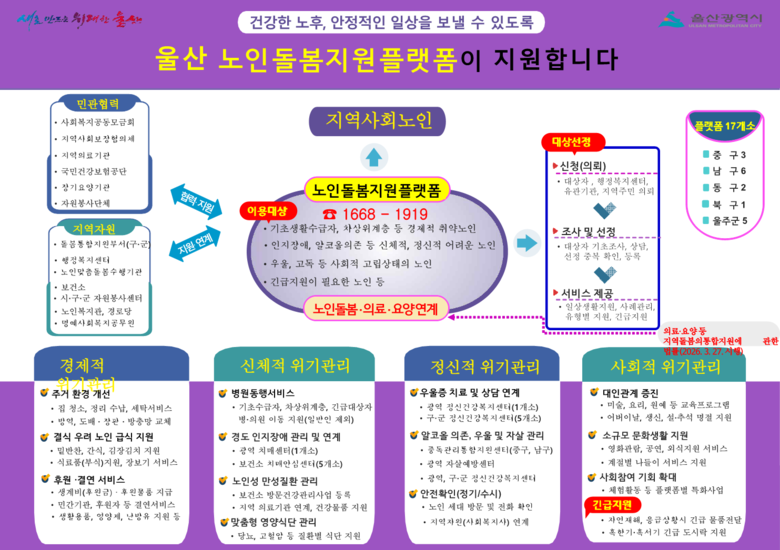 경제적, 신체적, 정신적, 사회적 위기관리사업*으로 구분되며 17개 플랫폼(중구3, 남구6, 동구2, 북구1, 울주군5)에 51명이 사업을 진행하고 있다.