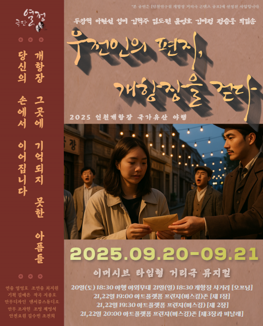 지난 6월 초연 당시 높은 관심과 호응을 얻었던 이 작품은 인천연구원(원장 박호군)의 「역사문화자산 가치화 사업」 1단계 성과물인 초단편 에세이 ????나는 개항장의 우전인입니다????가 원작이며, 개항장 일대의 장소와 이야기를 배경 삼아 관객 참여형 거리극 형식으로 구성되었다.