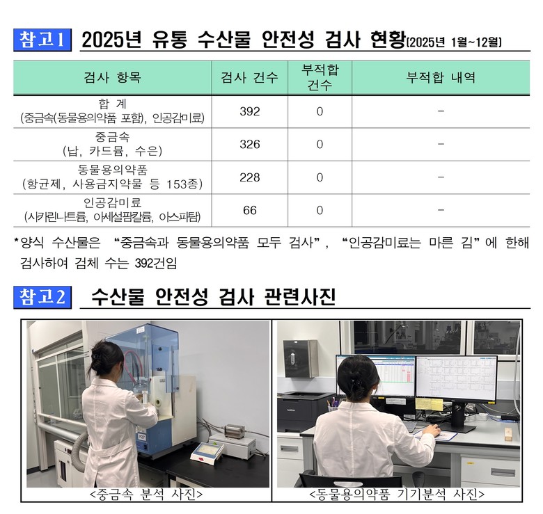이번 검사는 어류 등 총 392건*을 대상으로 하였으며, 안전기준 이상 잔류하면 건강에 위해한 유해중금속인 납‧카드뮴‧수은과 항균제‧사용금지약물 등 153종의 동물용의약품 및 마른김에 단맛을 내기 위해 부정 사용할 우려가 있는 사카린나트륨 등 인공감미료를 검사한 결과이다.
