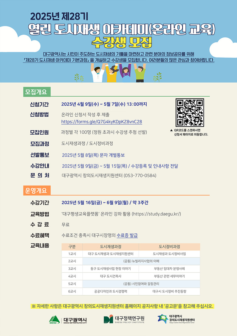 ▸ 5월 16일(금)부터 3주간 ‘대구평생학습플랫폼’ 내 수강 가능 [대구 세계타임즈=한윤석 기자] 대구광역시는 도시재생에 대한 다양한 정보 제공과 주민 주도의 도시재생 역량 강화를 위해 5월 16일(금)부터 3주간 운영하는 ‘제28기 열린 도시재생 아카데미 기본과정(온라인)’의 수강생을 모집한다.