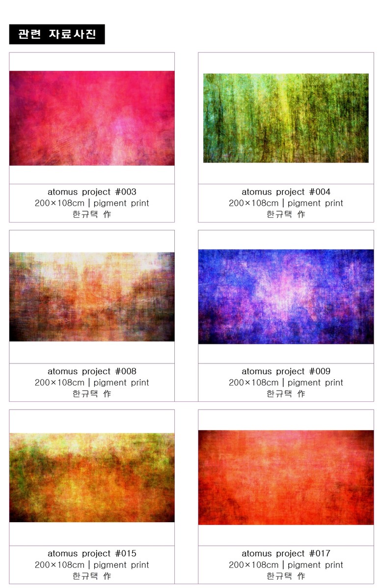 문자와 한글에 대한 작가의 관심은 10여 년간 찍은 수많은 사진과 만나 이번 전시 주제인 점 프로젝트(Atomus Project)로 이어졌다. 여러 장의 사진을 겹쳐 만들어진 이미지는 하나의 상이지만, 가까이서 들여다보면 수많은 점이 모여 구성되어 있음을 알 수 있다.