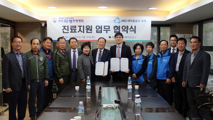 부천자생한방병원(병원장 왕오호)은 18일 성곡새마을금고(이사장 최종경)와 건강증진을 위한 의료지원 업무협약(MOU)을 맺었다고 밝혔다. 이번 협약은 상호 간의 협력을 통해 공동의 발전을 도모하고 나아가 지역사회의 복지향상에 기여하기 위한 취지로 마련됐다.