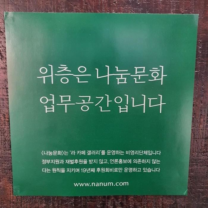 전시장과 카페가 함께 있다. 2층에서 전시를 관람하고 1층에서 전시에 대해 얘기를 나누고 책을 읽는 동선이다. 카페에서는 나눔문화를 후원하거나, 이번 전시과 관련된 기획 상품들을 구매할 수 있다.