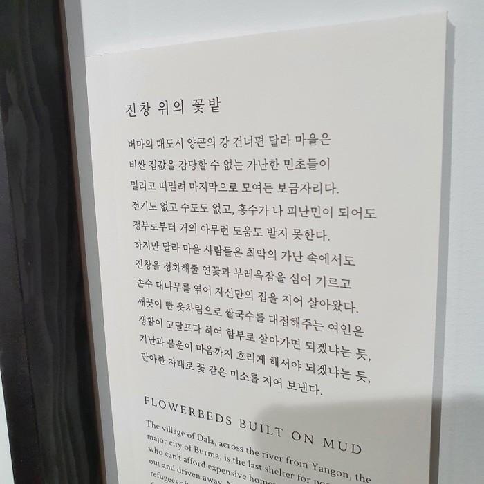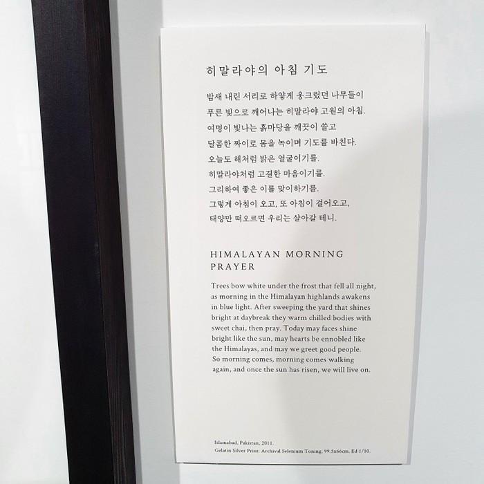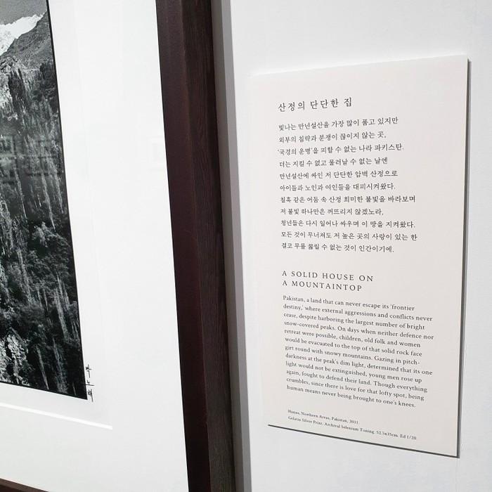 이번 전시의 제목은 '단단하게 단순하게 단아하게'다. 사진 속에는 단단하고, 단순하고, 단아하게 자신들의 삶을 지켜나가는 이들의 모습이 담겨있다. 분쟁과 전쟁으로부터. '인간의 욕심'이 있는 한 이는 쉽게 멈추지 않을 것이다. 하지만 '사랑'이 있는 한 그를 막기 위한 투쟁 또한 쉽게 멈추지 않을 것이다.