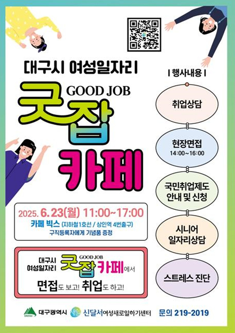 ▸ 현장면접 1개 업체, 간접채용 9개 업체 총14명 채용 예정 [대구 세계타임즈=한윤석 기자] 대구광역시는 취업을 희망하는 경력단절 및 미취업 여성을 위해 ‘찾아가는 여성일자리 ‘굿잡(Good Job)’카페’ 행사를 오는 6월 23일(월) 오전 11시부터 카페 빅스(도시철도 1호선, 상인역 4번출구)에서 운영한다.