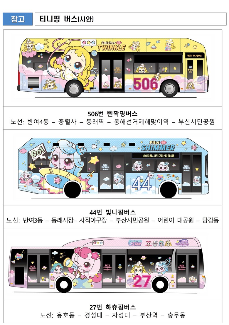 ▲506번 노선 ‘빤짝핑버스’ 1대(반여4동~동래역~부산시민공원) ▲44번 노선 ‘빛나핑버스’ 1대(반여3동~부산시민공원~당감동) ▲27번 노선 ‘하츄핑버스’ 1대(용호동~부산역~충무동)가 운행한다.