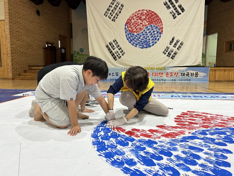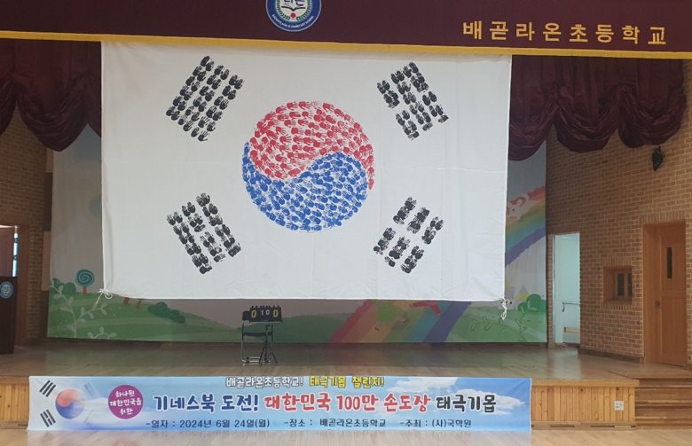 [시흥시 세계타임즈=송민수 기자] 배곧라온초등학교 5학년에서는 2024년 6월 24일(월) 호국보훈의 달을 맞아 나라사랑 계기교육을 특별한 방법으로 진행하였다. 학생들이 자신의 손도장을 찍어 5학년 전교생이 함께 태극기를 완성하는 ‘손도장 태극기 100만 챌린지’행사를 진행하였다.