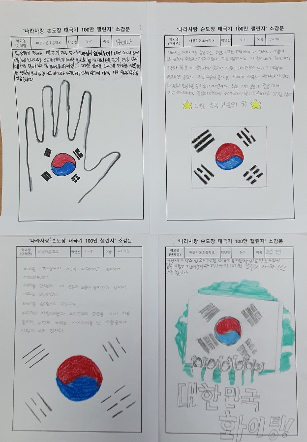손도장 태극기 100만 챌린지를 통해 진정으로 나라를 사랑하고 서로 협동하며 행복하게 성장하는 배곧라온초 교육공동체가 되기를 기대한다.