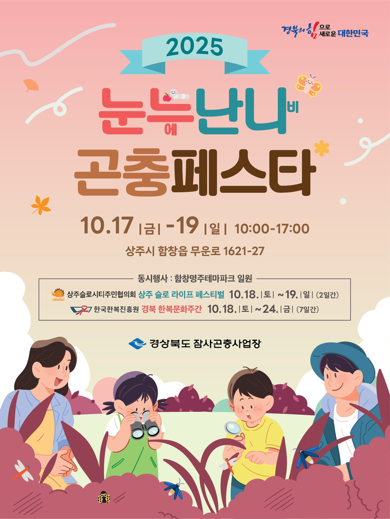 - 풍잠 감사제, 그린바이오 산업 연계 홍보관, 공연․체험 부스 운영 - [경북 세계타임즈=한윤석 기자] 경상북도 잠사곤충사업장은 17일부터 19일 3일간 잠사곤충사업장 일원에서‘2025 눈누(에)난나(비) 곤충페스타’를 개최한다.