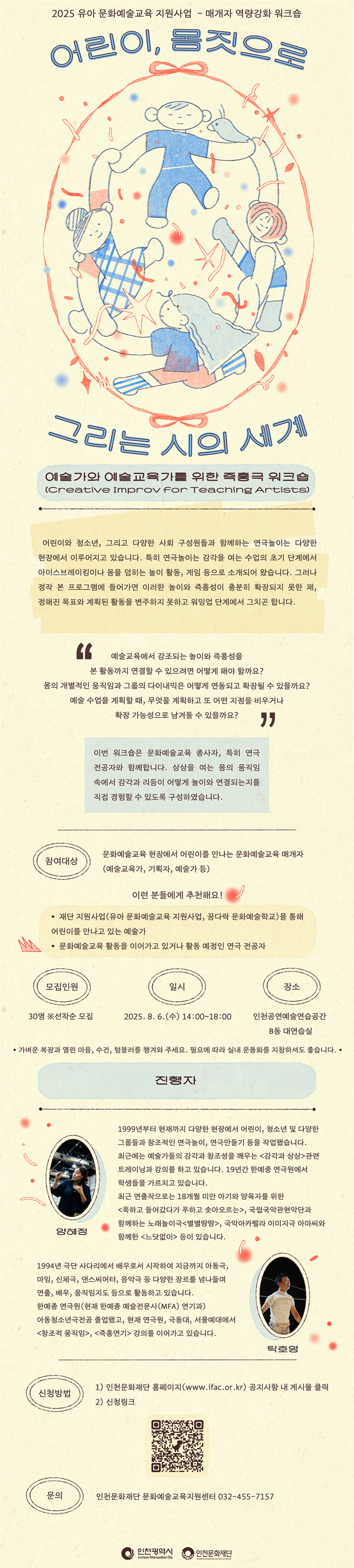 인천문화재단은 지난 <2024 문화예술교육 매개자 역량강화 프로그램 기획을 위한 수요조사>를 통해 매개자들이 현장에서 ‘참여자 이해’, ‘교육과정 개발’ 등에 어려움을 느끼고 있다는 점에 주목하여, 놀이와 즉흥성을 주제로 한 실습형 프로그램을 기획하였다. 특히 연극 기반 활동 비율이 높은 인천 지역의 특성과 예술교육 현장의 실질적인 수요를 반영해, 현장 적용이 가능한 밀도 높은 워크숍으로 구성하였다.