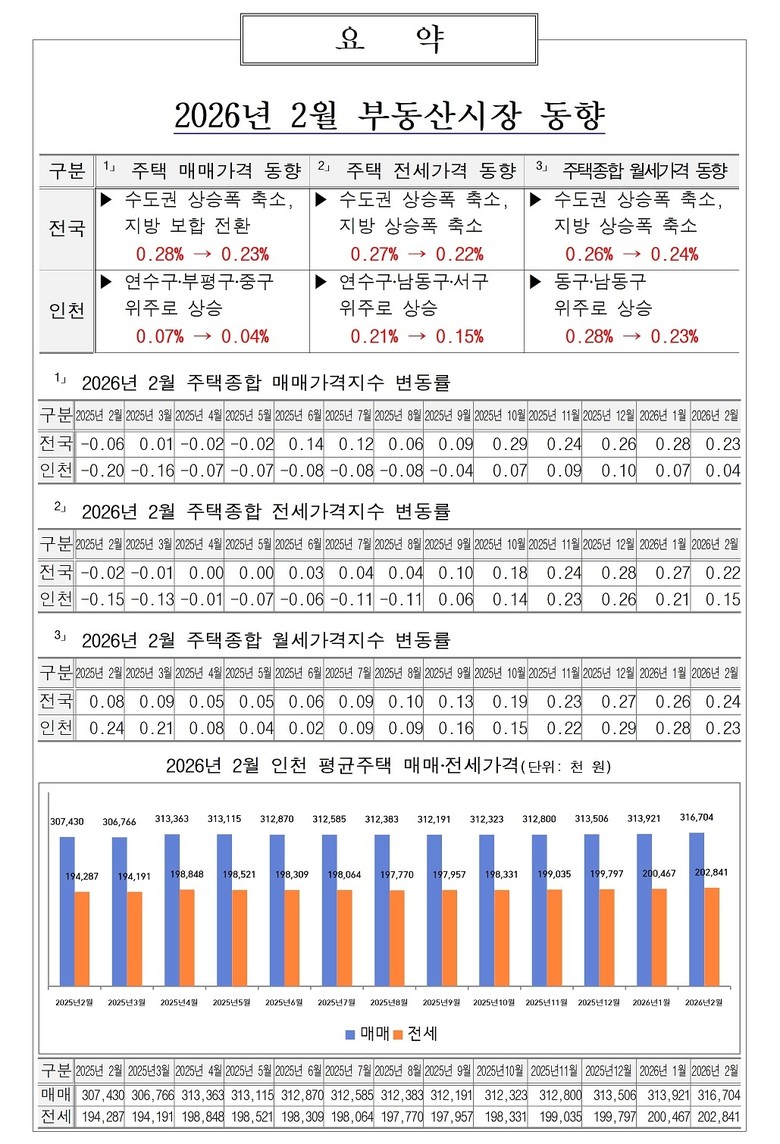 인천시가 한국부동산원의 부동산 통계정보를 분석한 ‘2026년 2월 부동산시장 동향 보고서’에 따르면, 2월 인천의 주택 매매가격지수 변동률은 전월 0.07%에서 0.04%로 상승세가 다소 둔화됐다. 지역별로는 연수구(0.47%), 부평구(0.09%), 중구(0.02%), 남동구(0.01%) 순으로 상승했으며, 미추홀구(0.00%)는 보합을 나타냈다. 반면 동구(-0.01%), 계양구(-0.10%), 서구(-0.12%)는 하락했다.
