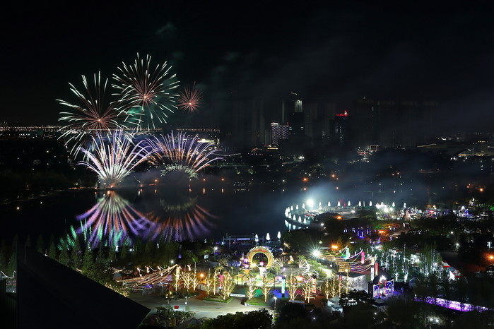 28일 고양시 호수공원에서는 2018고양국제꽃박람회 개막기념 콘서트가 성황리에 개최됐다. K-POP 가수들의 축하공연에 이어 밤하늘을 화려하게 수놓는 불꽃쇼가 성대하게 펼쳐졌다. 사진은 개막식 불꽃쇼가 펼쳐지고 있는 야간 꽃 박람회장 전경. 세계 꽃들의 눈부신 파노라마 2018고양국제꽃박람회는 5월 13일까지 개최된다.