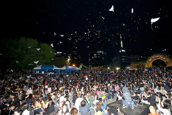 ‘2018고양국제꽃박람회’의 개막기념 ‘꽃과 평화의 콘서트’가 지난 28일 고양시 호수공원에서 펼쳐졌다. 이날 행사는 꽃박람회 개장을 기념하고 평화에 대한 국민적 염원을 담은 다양한 퍼포먼스로 꾸며졌다. 사진은 관람객들과 함께 꽃씨를 담은 LED 풍선과 비둘기 풍선을 날리는 ‘평화 퍼포먼스’의 모습.