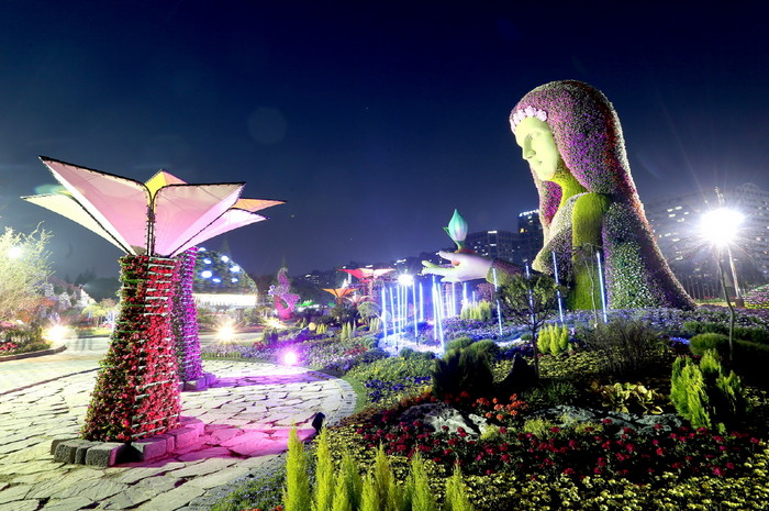 고양시 호수공원에서 개최되는 2018고양국제꽃박람회는 매일 밤 9시까지 야간 개장으로 낮보다 아름다운 꽃 축제의 밤을 선사한다. 사진은 꽃빛으로 더욱 아름다운 대지의 여신 ‘가이아’. 야간권은 18시 이후 입장 가능하며 입장권 가격은 6,000원이다.