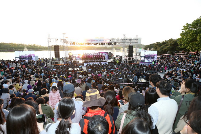 세계 꽃들의 향연 ‘2018고양국제꽃박람회’가 한창인 고양시 호수공원에서는 호수를 배경으로 마련된 무대에서 다양한 장르의 공연이 이어지고 있다. 사진은 개막기념 ‘꽃과 평화의 콘서트’가 있던 지난 28일 공연을 보려는 관람객들로 북적이는 모습.