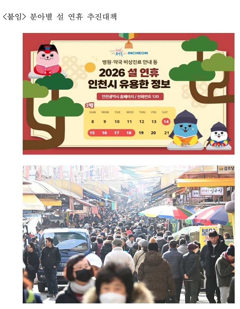 연휴 기간 교통, 의료, 물가, 성묘, 문화시설 운영 등 생활불편 문의가 집중될 것에 대비해 인천시는 120 미추홀콜센터를 특별 운영하고, 설 연휴 관련 생활정보를 종합 안내할 계획이다.