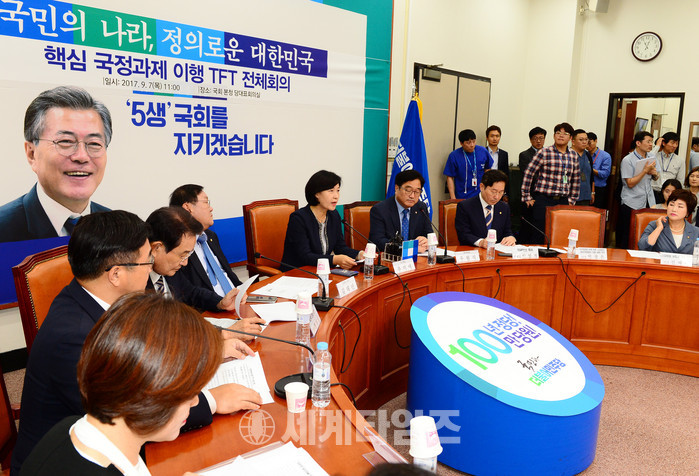 추미애 더불어민주당 대표가 7일 오전 서울 영등포구 여의도 국회 당대표 회의실에서 열린 ‘핵심국정과제 이행 TFT 전체회의’에서 모두발언을 하고 있다. 2017.09.07.