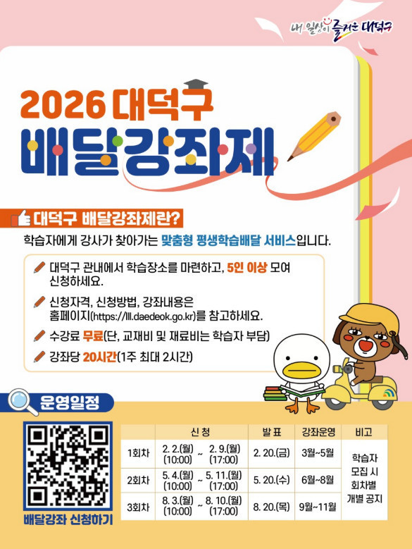 대덕구 관계자는 “찾아가는 배달강좌를 통해 평생학습 접근성을 높이고, 학습 소외계층에 대한 평생학습 지원을 확대해 나가겠다”며 “다양한 강좌로 구성된 2026년 배달강좌제에 구민 여러분의 많은 관심과 참여를 바란다”고 말했다.