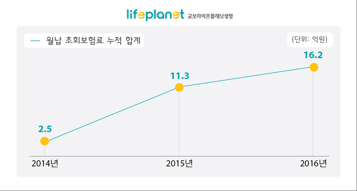 라이프플래닛은 2016년 연간 실적을 집계한 결과, 신계약 월납 초회보험료 누적 합계가 16억2천만원으로 전년 동기(11억3천만원) 대비 43.4% 증가했으며, 2016년 말 기준 누적 수입보험료는 전년 동기(101억여원) 대비 164.4% 증가한 267억여원을 기록했다고 9일 밝혔다.